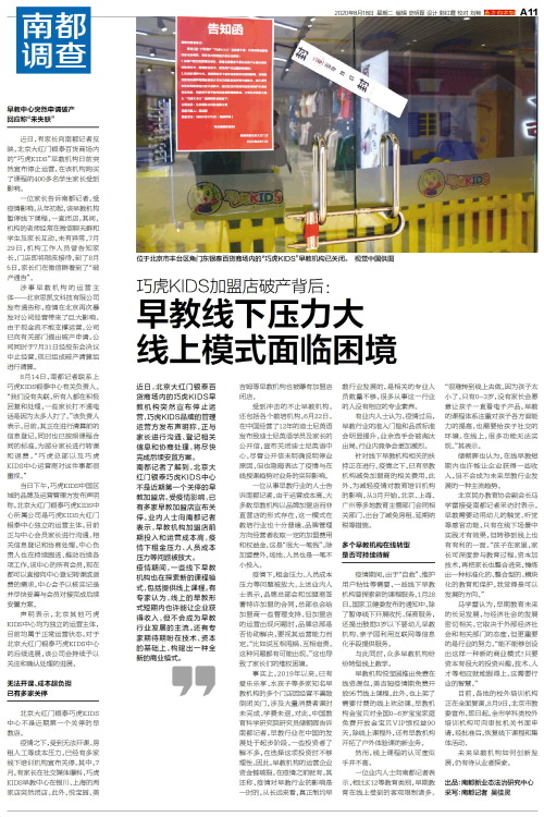 近日,北京大红门银泰百货商场内的巧虎KIDS早教机构突然宣布停止运营,巧虎KIDS品牌的管理运营方发布声明称,正与家长进行沟通、登记相关信息和协商处理,将尽快完成后续安置方案。南都记者了解到,北京大红