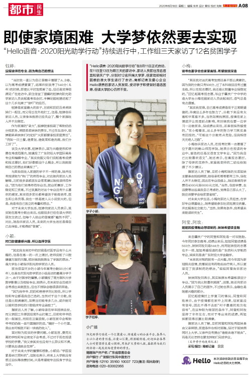 “Hello语音·2020阳光助学行动”在8月11日正式启动,在11日至13日为期三天的家访中,家访人员前往茂名信宜和肇庆广宁,分别对12名怀揣大学梦,但家境却相对困难的准大学生进行了走访。南都记者及