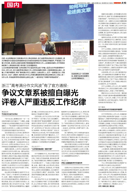 日前,长达两周的浙江高考满分作文之争迎来转折。浙江省教育考试院8月13日通报称,语文评卷组作文组组长的陈建新未经允许擅自泄露考生作文答卷及评卷细节,严重违反了评卷工作纪律,决定停止其参加高考评卷等国家