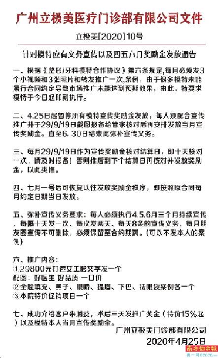 记者查看嘉嘉提供的补充协议模板,模板上称受疫情影响,甲方(立极美)经济受损严重,乙方(模特)本着体谅甲方的难处,同意变更原《整形模特合作协议》奖励金发放形式及日期,不再每月按时发放足额待还款。