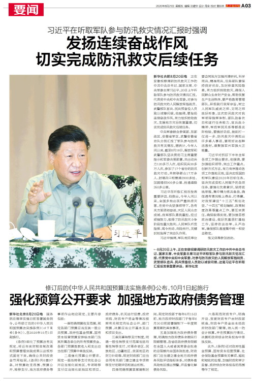 新华社合肥8月20日电 正在安徽视察调研防汛救灾工作的中共中央总书记、国家主席、中央军委主席习近平,20日上午听取军队参与防汛救灾情况汇报,代表党中央和中央军委,对参与防汛救灾的人民解放军指战员、武警