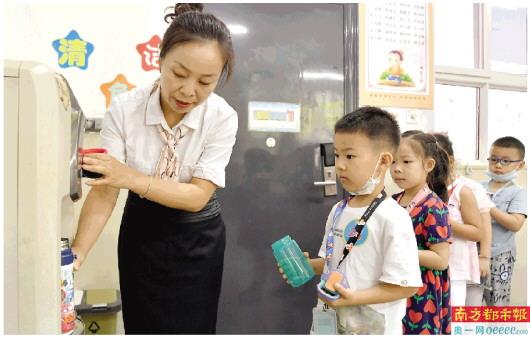 8月26日,西安高新第一小学老师指导一年级新生安全使用饮水机。临近秋季开学,该校为帮助新生尽快适应,开展入学教育活动。 新华社发