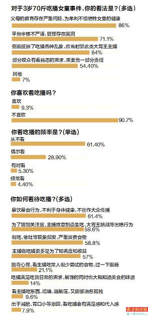为了解公众对吃播的态度和看法,南都民调中心社会群体和公众心理研究课题组8月27日至28日通过热点站站队平台发起网络调查,同时监测抖音、斗鱼和快手等平台对吃播视频的管控情况。调查发现:超八成受访者认为当事女童父母的教育有问题,七成人则反映平台审核监管不力;九成受访者明确表示不喜欢看吃播,六成人表示从不看吃播;公众对吃播视频已形成负面印象,六成人认为吃播更多是暴饮暴食行为,不宜作大众传播;八成人支持平台对恶俗吃播予以删作品、关停直播、封账号等处罚。同时,课题组监测发现主要平台和主播已纷纷除去“大胃王”标签并下架有关视频。对于大众喜欢观看吃播视频这一现象,心理学专家认为这与替代性满足心理、抵御孤独感和猎奇心理有关。