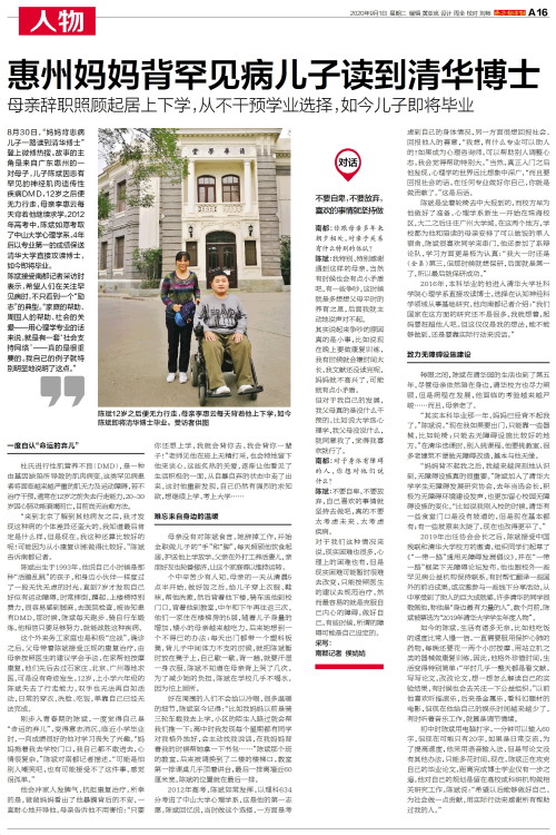 8月30日,“妈妈背患病儿子一路读到清华博士”登上微博热搜。故事的主角是来自广东惠州的一对母子,儿子陈斌因患有罕见的神经肌肉遗传性疾病DMD,12岁之后便无力行走,母亲李惠云每天背着他继续求学。201