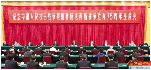 9月3日下午,中共中央、国务院、中央军委在北京人民大会堂举行座谈会,纪念中国人民抗日战争暨世界反法西斯战争胜利75周年。中共中央总书记、国家主席、中央军委主席习近平出席座谈会并发表重要讲话。 新华社发