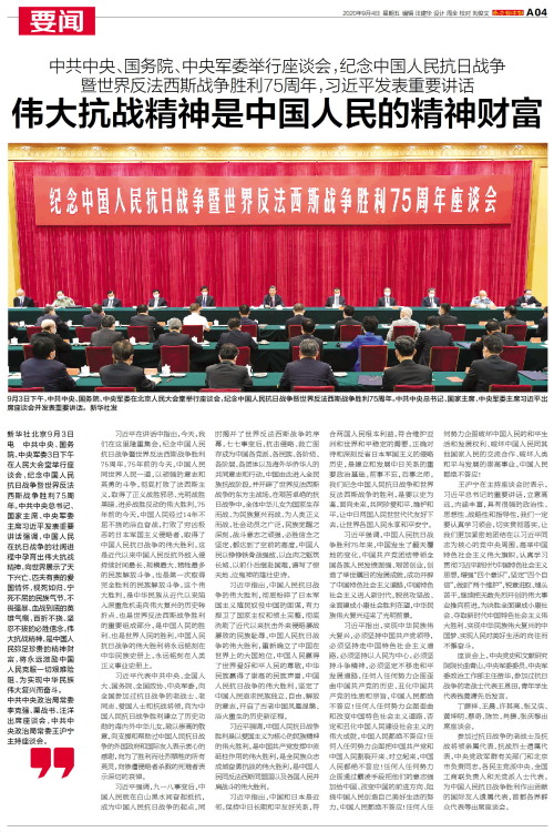 新华社北京9月3日电 中共中央、国务院、中央军委3日下午在人民大会堂举行座谈会,纪念中国人民抗日战争暨世界反法西斯战争胜利75周年。中共中央总书记、国家主席、中央军委主席习近平发表重要讲话强调,中国人