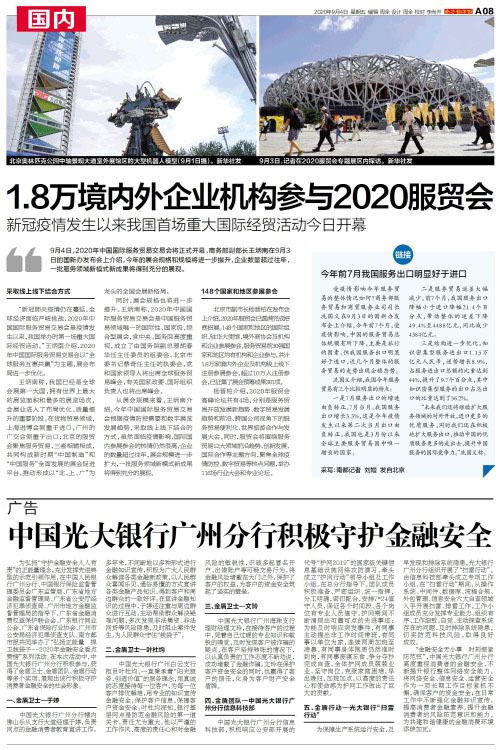 9月4日,2020年中国国际服务贸易交易会将正式开幕,商务部副部长王炳南在9月3日的国新办发布会上介绍,今年的展会规格和规模将进一步提升,企业数量超过往年,一批服务领域新模式新成果将得到充分的展现。采