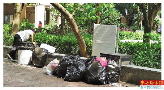 此前,记者现场走访逸景翠园东区发现,该小区A至H座为高层,呈一字排列。各栋楼下均有一个垃圾设点,选址在架空层、小区道路旁、公共水池边和休憩林荫下等。记者走在楼栋附近,不时就可以“遇见”一个个露天垃圾堆,用黑色垃圾袋装着的垃圾无序堆放,有垃圾细屑散落在旁引来蚊虫,风吹来可闻到轻微臭味。有的垃圾点还未来得及打包分类,直接散落一旁,成为露天垃圾场。
