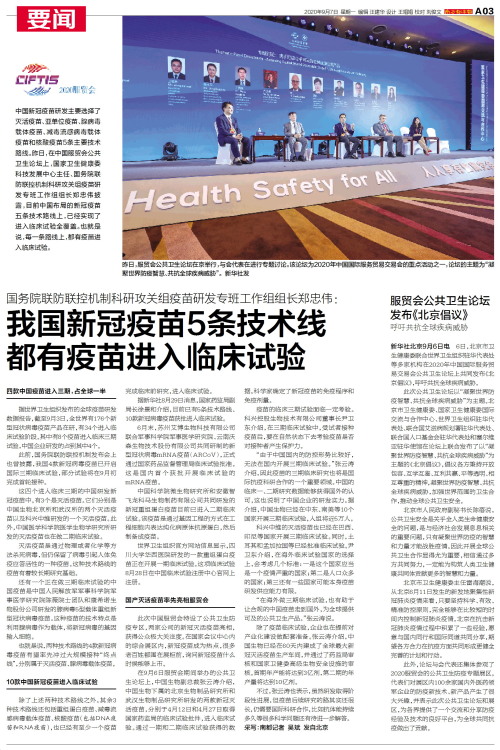 中国新冠疫苗研发主要选择了灭活疫苗、亚单位疫苗、腺病毒载体疫苗、减毒流感病毒载体疫苗和核酸疫苗5条主要技术路线。昨日,在中国服贸会公共卫生论坛上,国家卫生健康委科技发展中心主任、国务院联防联控机制科研
