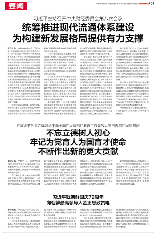 新华社电 中共中央总书记、国家主席、中央军委主席、中央财经委员会主任习近平9月9日下午主持召开中央财经委员会第八次会议,研究畅通国民经济循环和现代流通体系建设问题,研究党的十九大以来中央财经委员会会议