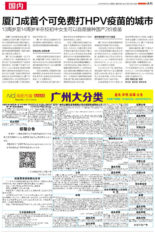 厦门成首个可免费打HPV疫苗的城市