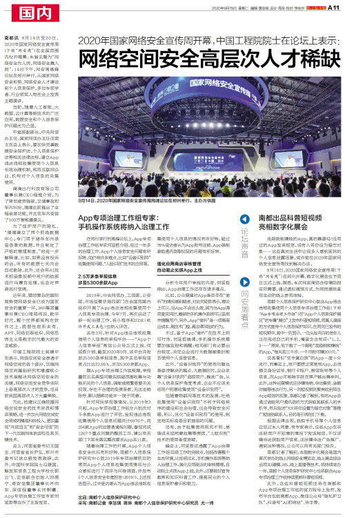 南都讯 9月14日至20日,2020年国家网络安全宣传周(下称“网安周”)在全国范围内拉开帷幕,本届主题为“网络安全为人民,网络安全靠人民”。14日下午,网安周高峰论坛在郑州举行。从国家网络安全形势、