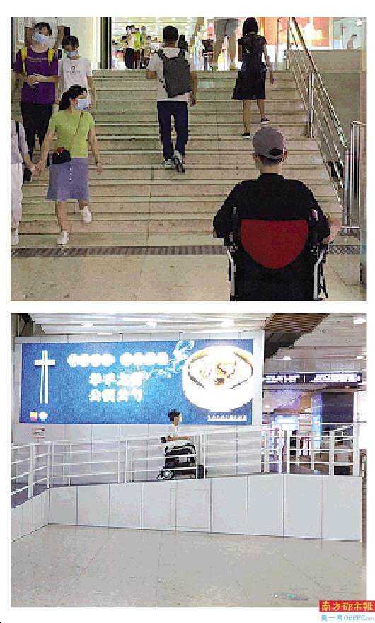 此前,从珠江新城地铁站D出口进入花城汇通道,距离地铁口约40米的地方,有一处高度差1.8米的阶梯。因为该阶梯太高,周边没有无障碍通道,残障人士无法通过,只能绕行。市民小方告诉记者,几分钟的路程坐轮椅要绕行一小时。