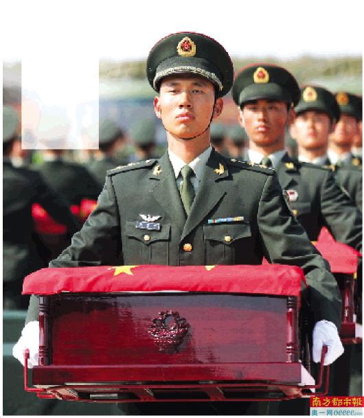 昨日,在沈阳桃仙国际机场,礼兵将殓放志愿军烈士遗骸的棺椁从专机上护送至棺椁摆放区。当日,第七批117位在韩中国人民志愿军烈士遗骸由中国空军专机护送从韩国接回辽宁沈阳。 新华社发