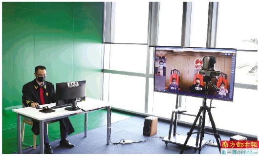 7月13日上午,广州互联网法院一名法官通过“YUE法庭”开庭,法官、陪审员实现异地同框参加庭审。 南都记者 何玉帅 摄