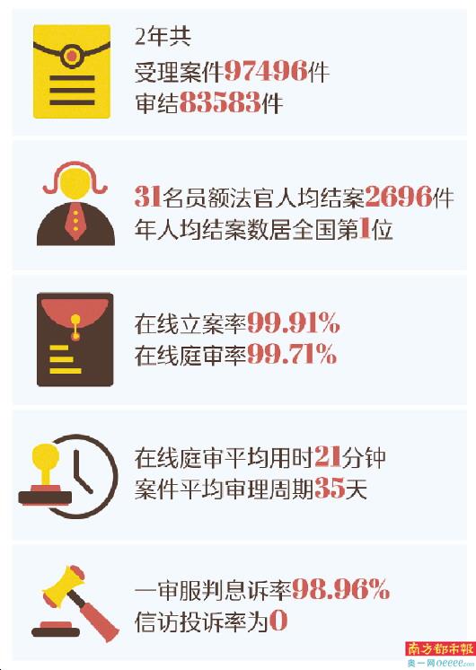 据统计,截至今年8月31日,广州互联网法院共受理案件97496件,审结83583件;31名员额法官人均结案2696件,年人均结案数居全国首位;在线立案率99.91%,在线庭审平均用时21分钟,案件平均审理周期35天;一审服判息诉率98.96%,信访投诉率为零。