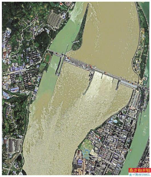 葛洲坝,大坝泄洪情景清晰可见,水流汹涌,与旁边船闸平静的水面形成鲜明对比。
