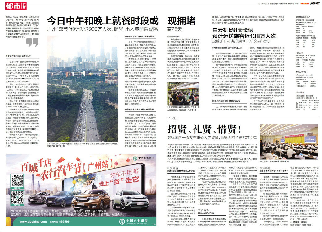 南都讯 实习记者梁思华 记者冯芸清 9月30日,“云山珠水,吉祥花城”庆“双节”新闻发布会举行。广州市交通运输局党组成员、副局长沈颖表示,“双节”假期全国高速公路对7座及以下小型客车实施免费通行政策,