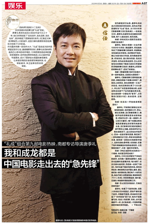 唐季礼说,《急先锋》才是他想要做的中国式系列电影。 《急先锋》是继《十二生肖》《功夫瑜伽》后的第九部“礼成”巨制,唐季礼导演与成龙大哥合作迄今已三十年,他