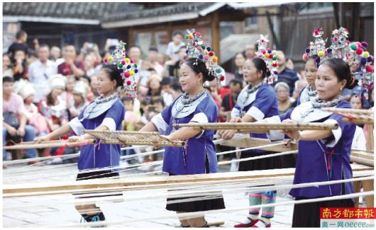 2014年贵广高铁开通运营以来,广西柳州市三江侗族自治县依托少数民族风情资源优势,全力做好旅游扶贫。10月2日,侗族群众在三江侗族自治县林溪镇程阳八寨景区表演侗族纺纱。 新华社发