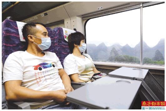 10月1日上午,吴育位与妻子乘高铁回贵州老家,窗外广西桂林风光如画。