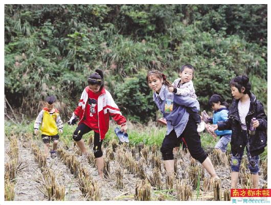 吴玉花带着侄儿侄女们在田间地头玩耍。
