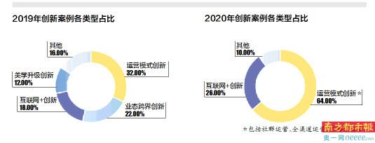 疫情助推供需两侧加速向线上迁移。为了顺应这种趋势,广东连锁企业创新发展的思路与去年相比,发生了明显的变化。去年南都大数据研究院零售实验室课题组联合广东省连锁经营协会调研的50个创新案例中,占比最大的是运营模式创新案例,达到32%;其次是业态跨界融合创新案例,占比22%;另外有12%的案例涉及美学升级创新,有18%的案例关于互联网+创新案例。
