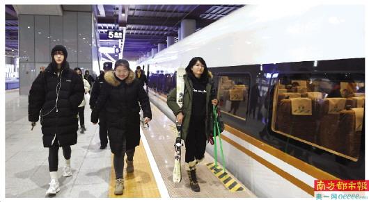 ←在京张高铁清河站,北京的滑雪爱好者肖祯(前右)拿着雪板雪杖准备乘坐京张高铁G8827次列车前往河北崇礼滑雪(1月11日摄)。