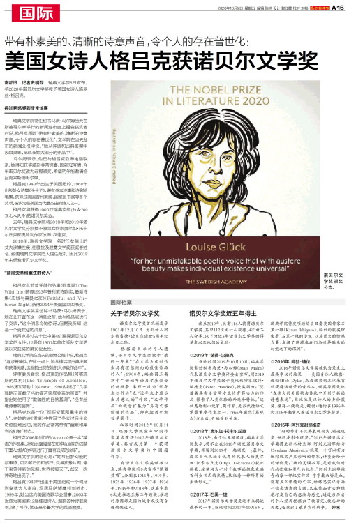 南都讯 记者史明磊 瑞典文学院8日宣布,将2020年诺贝尔文学奖授予美国女诗人路易丝·格吕克。得知获奖感到非常惊喜瑞典文学院常任秘书马茨·马尔姆当天在斯德哥尔摩举行的新闻发布会上揭晓获奖者时说,格吕克