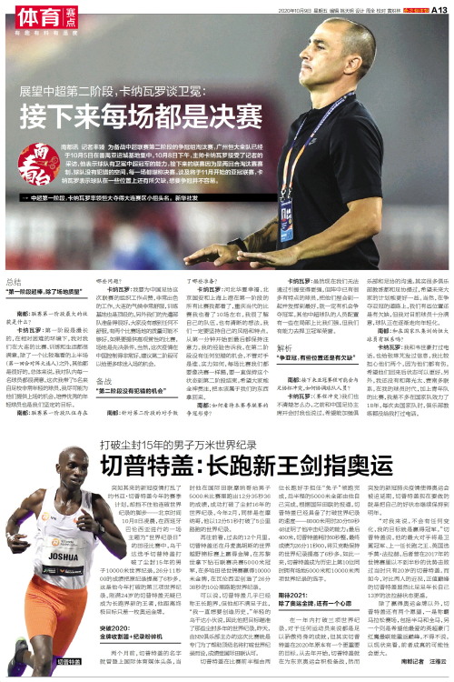 南都讯 记者丰臻 为备战中超联赛第二阶段的争冠组淘汰赛,广州恒大全队已经于10月5日在番禺亚运城基地集中。10月8日下午,主帅卡纳瓦罗接受了记者的采访,他表示球队有卫冕中超冠军的能力,接下来的联赛因为