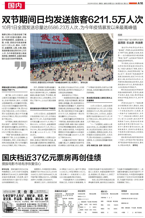 南都记者从交通运输部了解到,10月1日至8日国庆、中秋双节假期期间,全国铁路、公路、水路、民航日均发送旅客6211.5万人次。其中,10月1日,全国铁路、公路、水路、民航发送旅客总量达到6586.23