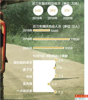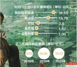 截至10月8日21时,国庆档观影总票房累计超39.5亿,总观影人次近亿,位居中国影史国庆档票房第二。2020年国庆档仅次于2019年春节档的59.03亿,2018年春节档的57.71亿和2019年国庆档的44.66亿元,达到了节庆档期第四高。据灯塔专业版数据,《我和我的家乡》以18.7亿票房位居国庆档票房榜首,《姜子牙》高开低走拿下13.8亿,《夺冠》在国庆期间产生票房3.6亿,累计票房6.4亿。