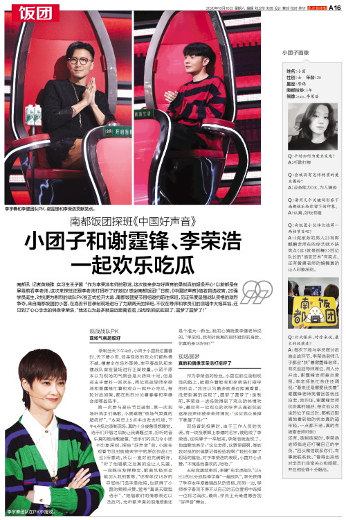 南都讯 记者黄晓雅 实习生王子茵 “作为李荣浩老师的歌迷,这次能来参与好声音的录制真的超级开心!以前都是在屏幕前看李老师,这次来探班还跟李老师打招呼了好激动!感谢南都饭团!”日前,《中国好声音》随着盲