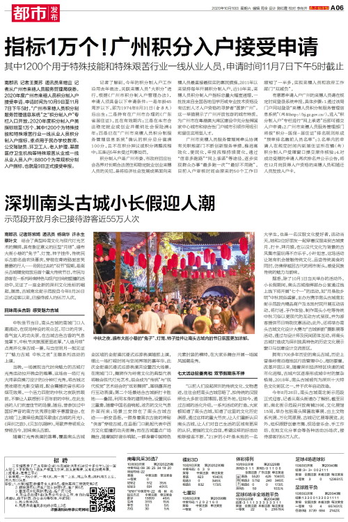 南都讯 记者王美苏 通讯员来穗宣 记者从广州市来穗人员服务管理局获悉,2020年度广州市来穗人员积分制入户接受申请,申请时间为10月9日至11月7日下午5时,“广州市来穗人员积分制服务管理信息系统”之
