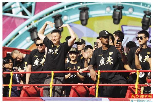 3. 昨天下午,广东队在广州展开冠军巡游,杜锋对着现场大批粉丝“比心”。南都记者 黎湛均 摄