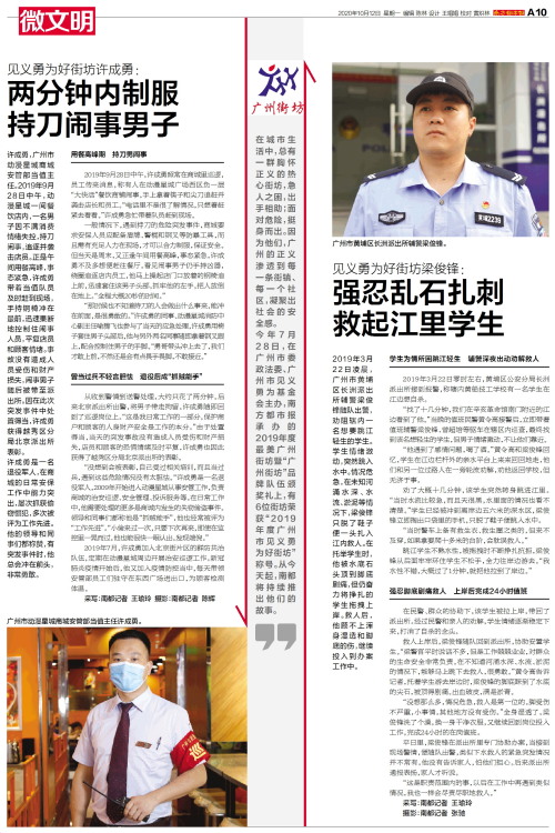 在城市生活中,总有一群胸怀正义的热心街坊,急人之困,出手相助;面对危险,挺身而出。因为他们,广州的正义渗透到每一条街镇、每一个社区,凝聚出社会的安全感。今年7月28日,在广州市委政法委、广州市见义勇为