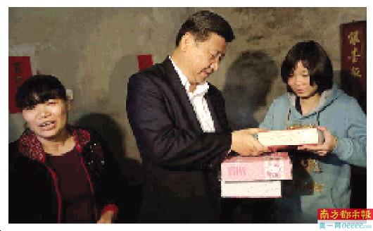 上午,习近平步行穿过村里的马路,探访贫困家庭。张锡尧夫妇因病致贫,生活在低矮、昏暗的平房里,医药费和孩子的学费对他们来说是个沉重的负担。总书记逐个房间察看,与他们促膝长谈,了解困难,倾听期盼。听说张锡尧的女儿正在念高三,学习勤奋刻苦,成绩名列前茅。“古话说,家贫子读书。知识可以改变命运。”习近平鼓励她积极向上、自强不息,要好好读书,并送给她一本《现代汉语词典》、一本《英汉词典》和“快译通”。