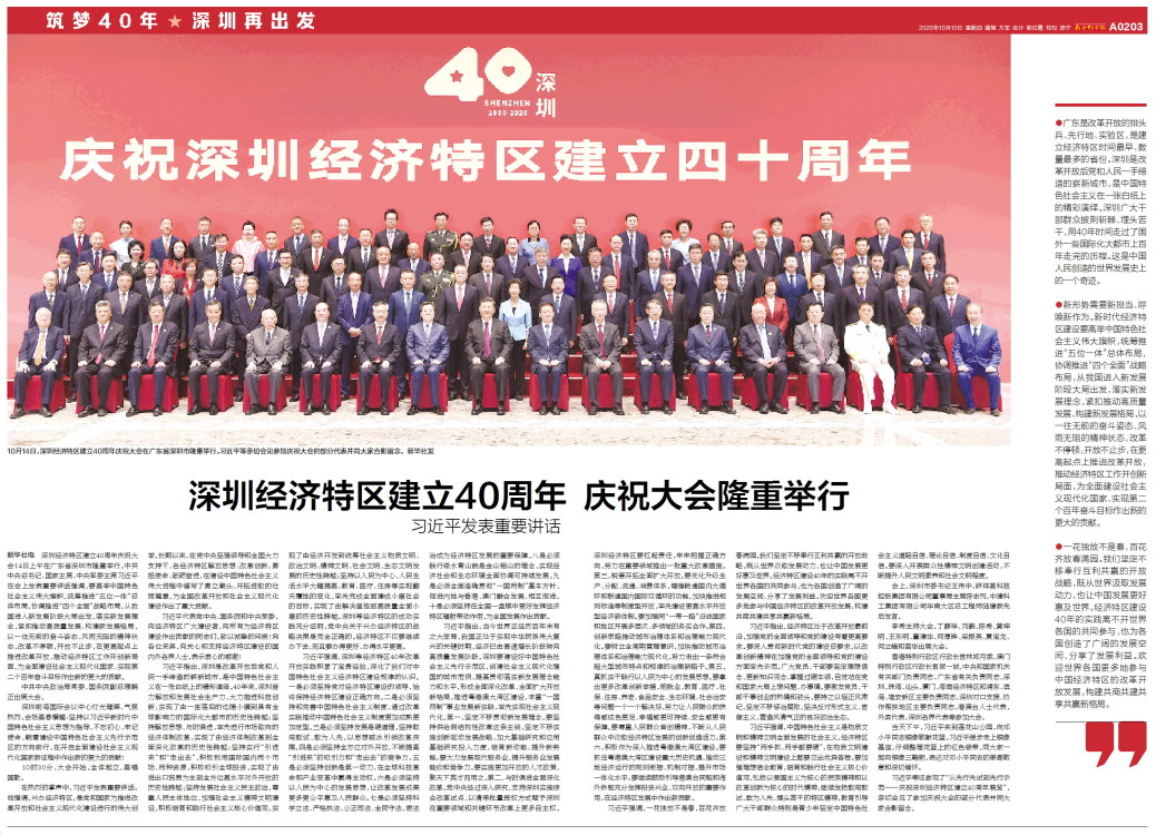 10月14日,深圳经济特区建立40周年庆祝大会在广东省深圳市隆重举行。习近平等亲切会见参加庆祝大会的部分代表并同大家合影留念。 新华社发 新华社电 深圳经济特区建立40周年庆祝