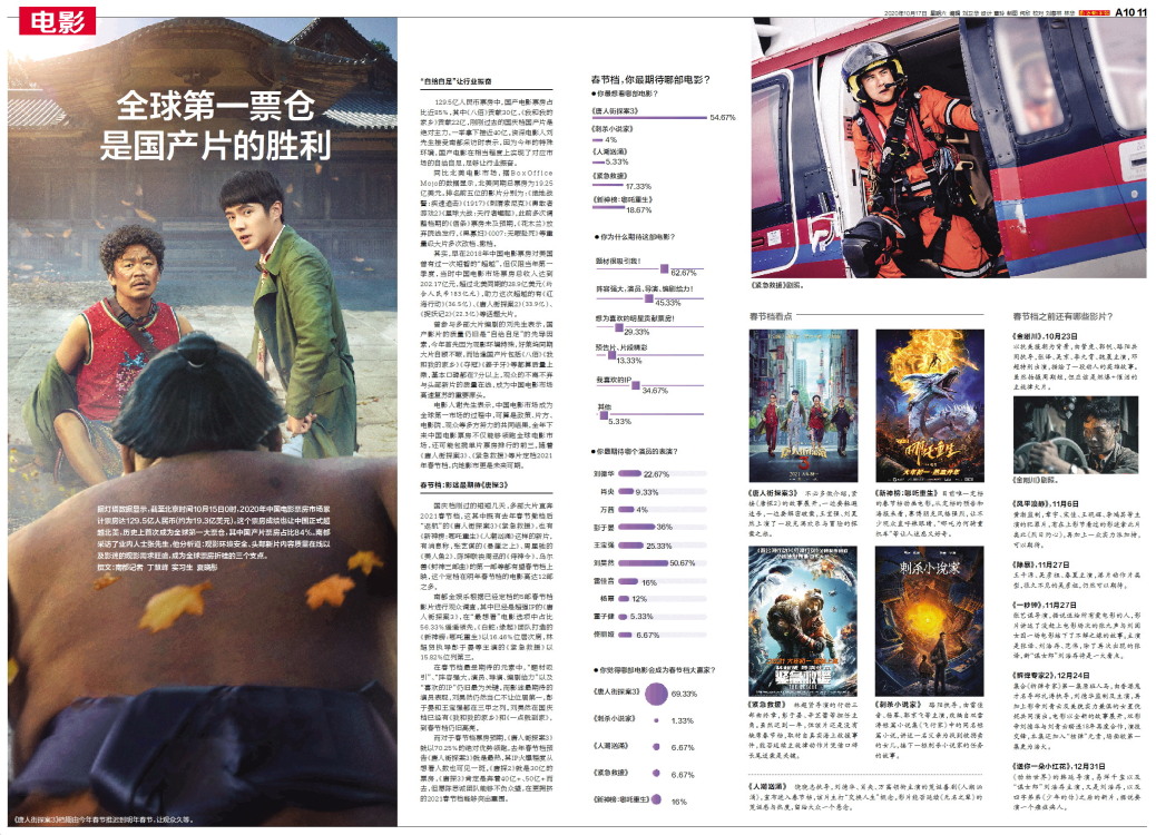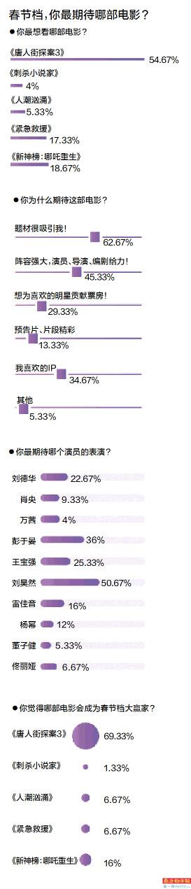 南都全娱乐根据已经定档的5部春节档影片进行观众调查,其中已经是超强IP的《唐人街探案3》,在“最想看”电影选项中占比56.33%遥遥领先,《白蛇:缘起》团队打造的《新神榜:哪吒重生》以16.46%位居次席,林超贤执导彭于晏等主演的《紧急救援》以15.82%位列第三。