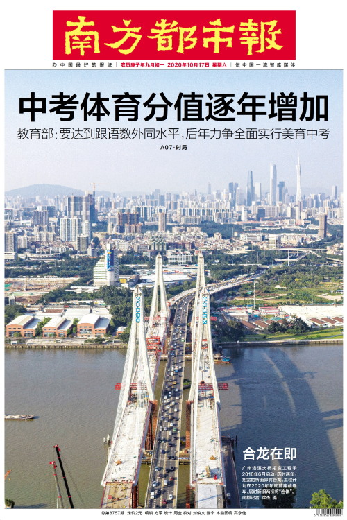 广州洛溪大桥拓宽工程于2018年6月启动,历时两年,拓宽的桥面即将合龙。工程计划在2020年年底前建成通车,届时新旧两桥将“连体”。南都记者 徐杰 摄
