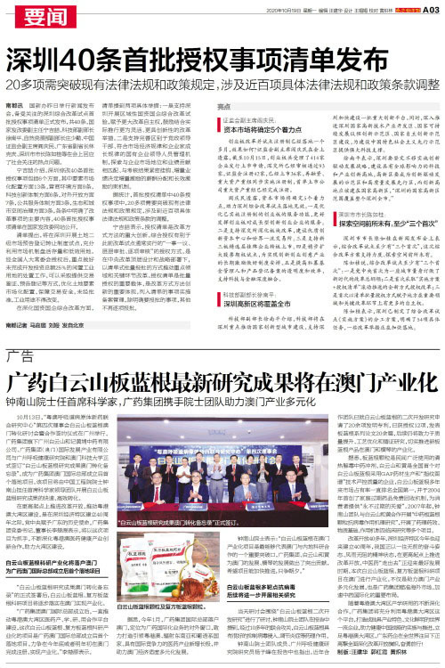 专题10月13日,“粤澳呼吸道病原体新药联合研究中心”第四次理事会白云山板蓝根澳门转化研讨会暨合作签约仪式在广州举行。广药集团旗下广州白云山和记黄埔中药有限公司、广药集团(澳门)国际发展产业有限公司与