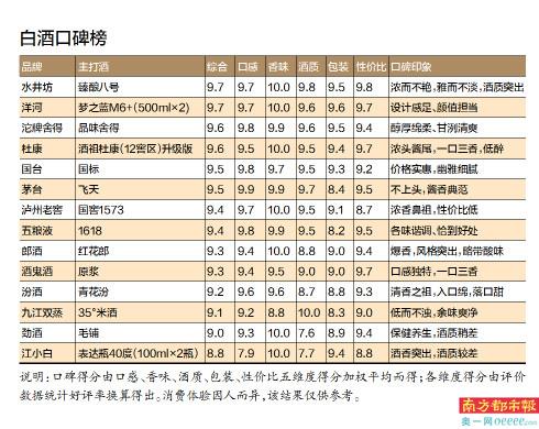 性价比是大众关注较多的一个问题,此次白酒测评中,谁才是性价比之王呢?口碑结果显示,水井坊以98%的好评率位列第一名,获得9.8分。洋河、酒鬼酒、杜康获得9.7分,并列第二。