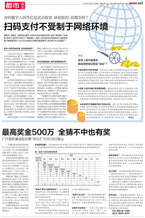 南都讯 持续近一周的深圳数字人民币红包试点顺利收官,通过“幸运者们”的亲测,数字人民币终于掀开了“神秘面纱”。数字人民币的支付体验如何?消费者和商户接受度怎样?从此次试点活动又能窥见哪些数字人民币的“