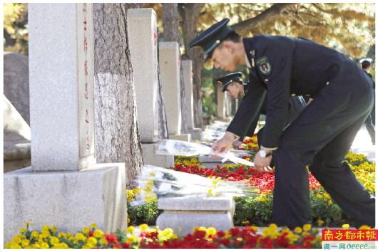 10月23日,在辽宁沈阳抗美援朝烈士陵园敬献花篮仪式上,部队官兵向志愿军烈士墓献花。新华社发