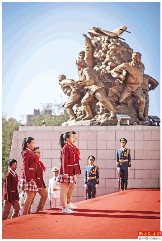 10月23日,在丹东抗美援朝纪念塔敬献花篮仪式上,学生代表瞻仰丹东抗美援朝纪念塔。新华社发