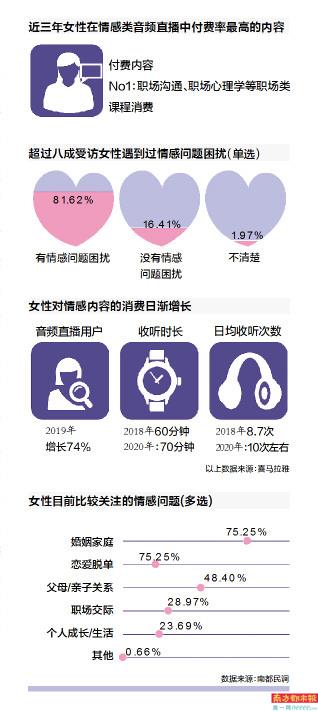 女性用户为情感内容付费的意愿也在攀升。喜马拉雅大数据显示,2018年收听情感类音频直播的有打赏行为的女性用户占总打赏人数的约31%,两年后就上升至38%左右。而且2019年的人均打赏金额达到约624元,比上一年整整高出95元。其中,如《5节课教你成为高效沟通的职场人》、《10节课教你洞察人心的职场心理学》”等职场沟通课程都是热门付费类型。另外,超六成受访女性表示,未来在遇到情感问题时会考虑接受专业化咨询服务。