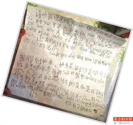 这封信里稚嫩的文字夹杂大量拼音,是一个六岁孩子在大声呐喊着:“爸爸妈妈,请把我的快乐还给我!”她在呼叫着父母的关注,让人惊觉:这是一个内心高度敏感、却心怀忧郁的孩子,让人难以想象只有六岁。