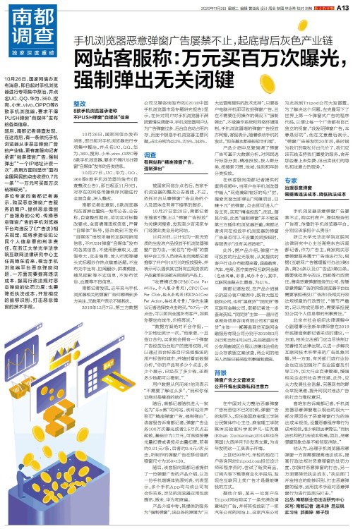 10月26日,国家网信办发布消息,即日起对手机浏览器进行专项集中整治,并点名UC、QQ、华为、360、搜狗、小米、vivo、OPPO等8款手机浏览器,要求不得PUSH弹窗“自媒体”发布的各类信息。随后