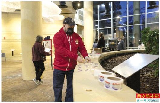 11月3日,选民在美国弗吉尼亚州阿灵顿一处投票站投票后领取大选标贴。 新华社发