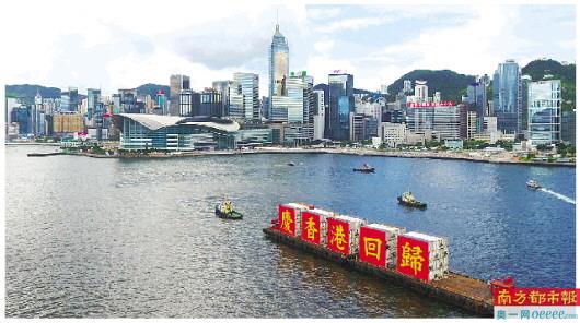 7月1日,载着“庆香港回归”标语的船只从香港维多利亚港驶过,庆祝香港回归祖国23周年。 新华社发